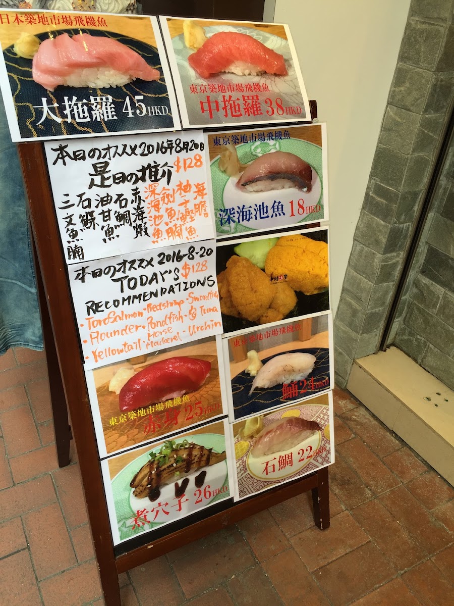 中拖羅 ×5 , 三文魚 ×5 , 油甘魚 ×5 , 赤海蝦 ×5 , 赤貝 ×5 , 左口魚裙邊 ×5 , 帶子 ×5 , 鰻魚 × , 三文魚籽 ×5 黃金魷魚 ×5